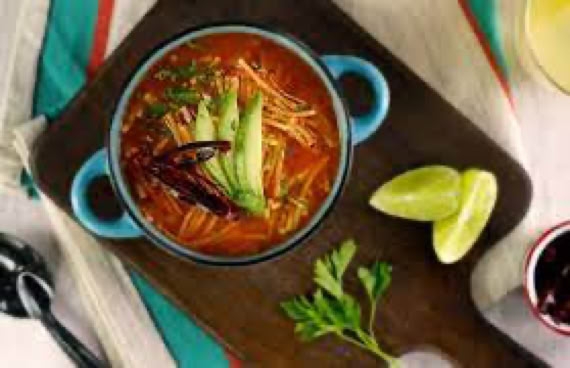 Soupe au piment guajillo avec tomates et nouilles de quinoa .