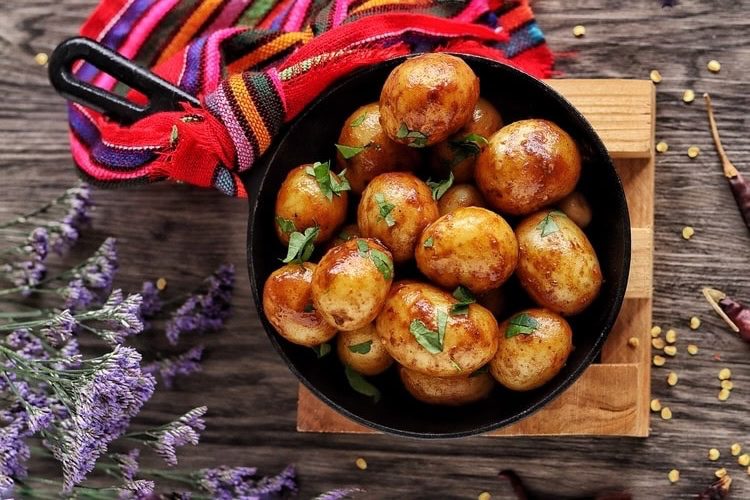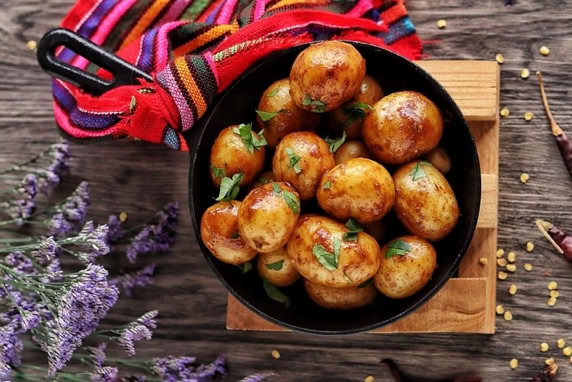 Patacas con salsa de varios chiles, receita da casa.