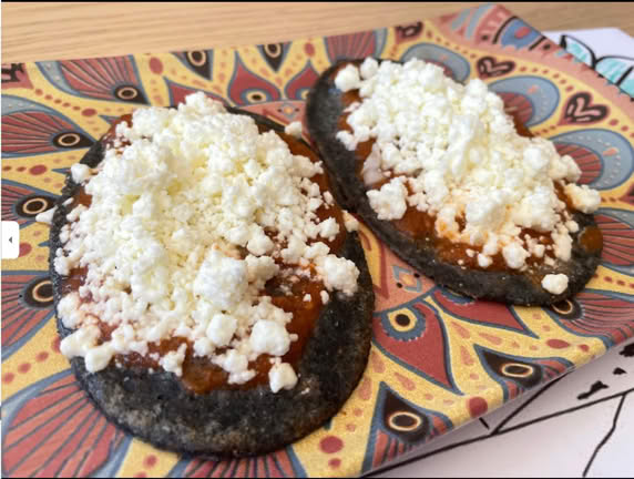 Tortillas de millo fritas con fabas, queixo fundido e pico de gallo con jalapeño.